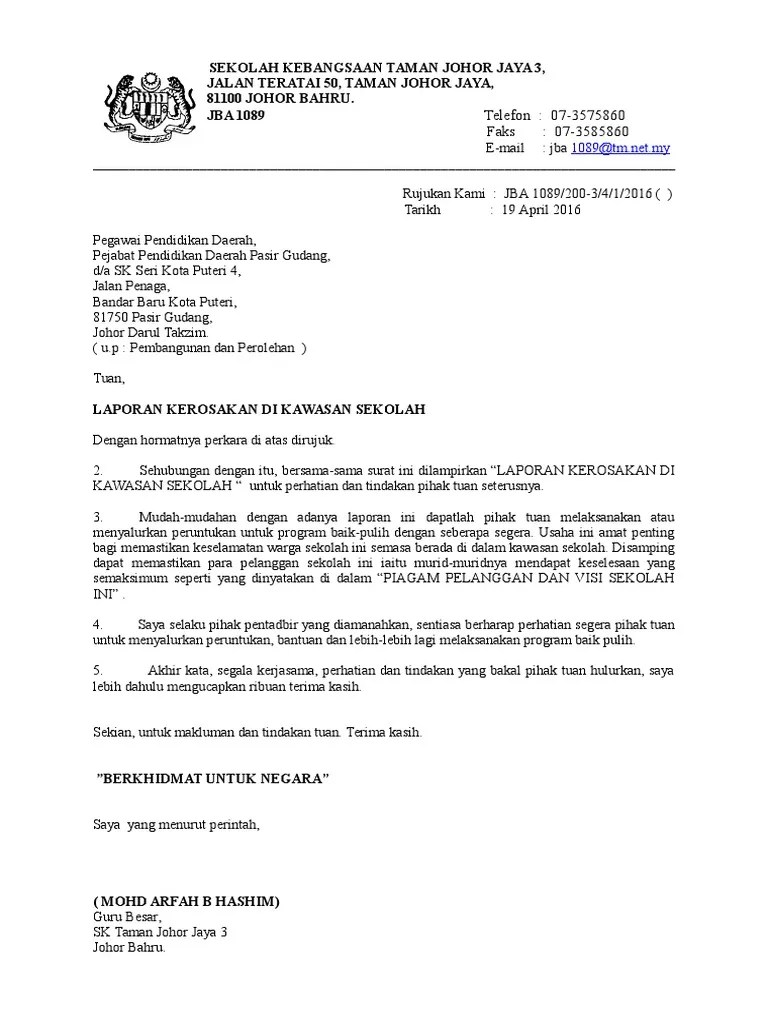 Contoh Surat Rasmi Aduan Kerosakan Rumah Frasmi